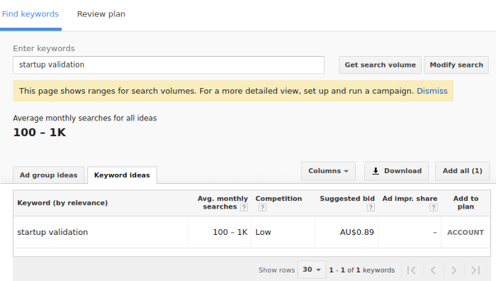 You’re looking for a couple of keywords with at least 100–1k monthly searches. If it’s < 100 for everything, then you’re going to struggle to validate your idea with this method.