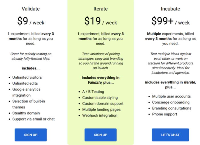 This isn’t where you should start though — you want to set the price as high as you can imagine anyone paying, then push it up some more, then see what happens. If you don’t get any bites, then you can reduce it and try again. An entrepreneur’s bias is to undervalue their product, so the benefit of playing around with pricing now is that there’s no harm in setting too high a price — you can’t be worried about losing sales because you don’t actually have a product to sell.
