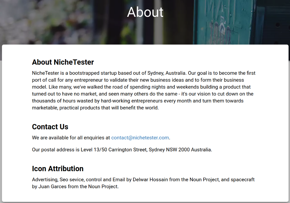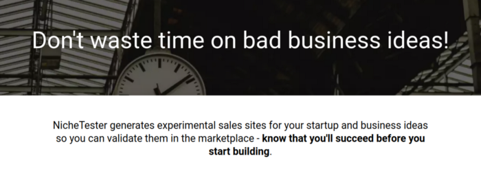The first part of the landing page is an attention-grabbing title — a one-liner that immediately piques the user’s interest and makes them continue reading. Usually this is your product’s key value proposition — for instance the whole point of NicheTester is to stop entrepreneurs wasting time building a product that has no market, so at the top of my landing page it says “Don’t waste time on bad business ideas!”