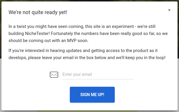 The idea is to create what Rob Walling describes as a “mini sales site” in Start Small Stay Small, and which has been known in the mail-order marketing world for decades as a dry test. The idea is to set up a landing page that looks like it’s selling our finished product, run ads against it, and measure how many people click the “buy” (or “try”, or “sign up” etc.) button. When this happens, a little modal (less-obnoxious pop-up) comes up, informs the customer that you’re still testing the idea and that it’s not ready yet, and asks them to leave their email to be notified when it is.