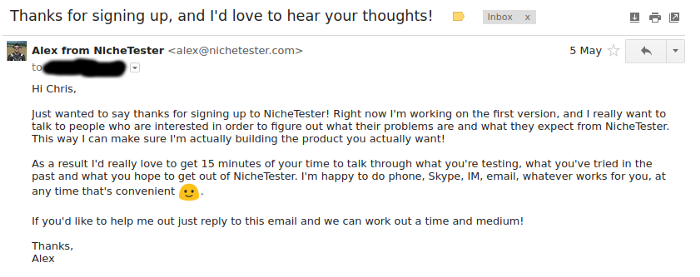 If you use these more advanced tools, you’ll probably be thinking about sending an automated signup email. Don’t! You want to manually send an email, after a delay, making it as personal as possible. People are used to getting automated emails when they sign up for something… and they don’t read them. By sending a manual email you massively increase the chances that the person will actually read it and respond.