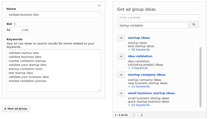 Remember how before we started you had a look at what people were searching for with Google Keyword Planner? You want to group these into themes (e.g. for me, “test business idea” and “validate business idea” are part of the same theme) and create an ad group for each.
