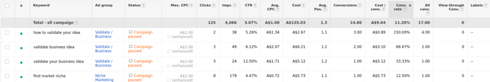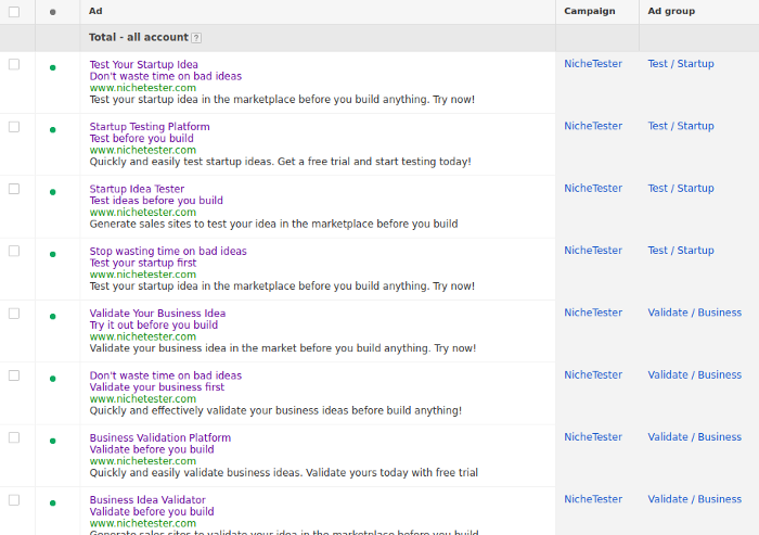 For instance, when I was testing NicheTester I had one ad group for “Niche Marketing”, with keywords related to that, and another for “Business Idea Validation”, which you can see above.