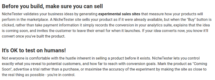 Now we’ve got a landing page set up, it’s time to fill it with content. I’m going to describe how I like to write a landing page, with the NicheTester page as my example — this is far from the canonical way to do it, so play around with the format if you like. The guiding principle is to keep it simple: explain exactly what your product is and how it helps as clearly and as early as you can. Don’t follow the example of big companies with oblique landing pages that don’t explain anything, these are often intentionally optimized for goals other than conversion, and aren’t good role models.